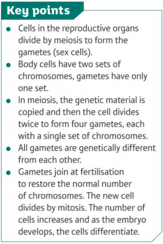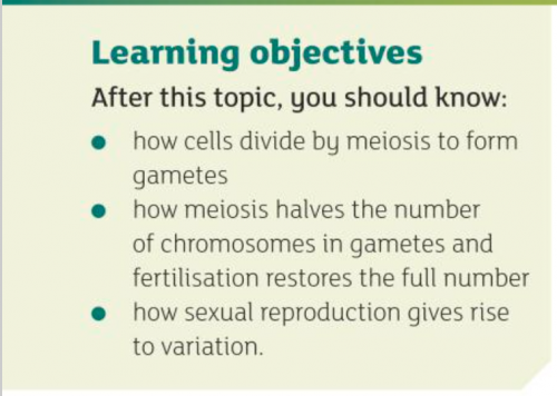 - State that meiosis halves the number of chromosomes in gametes and fertilisation restores the full number.