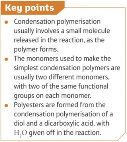 - Explain the process of condensation polymerisation in detail, including using equations.